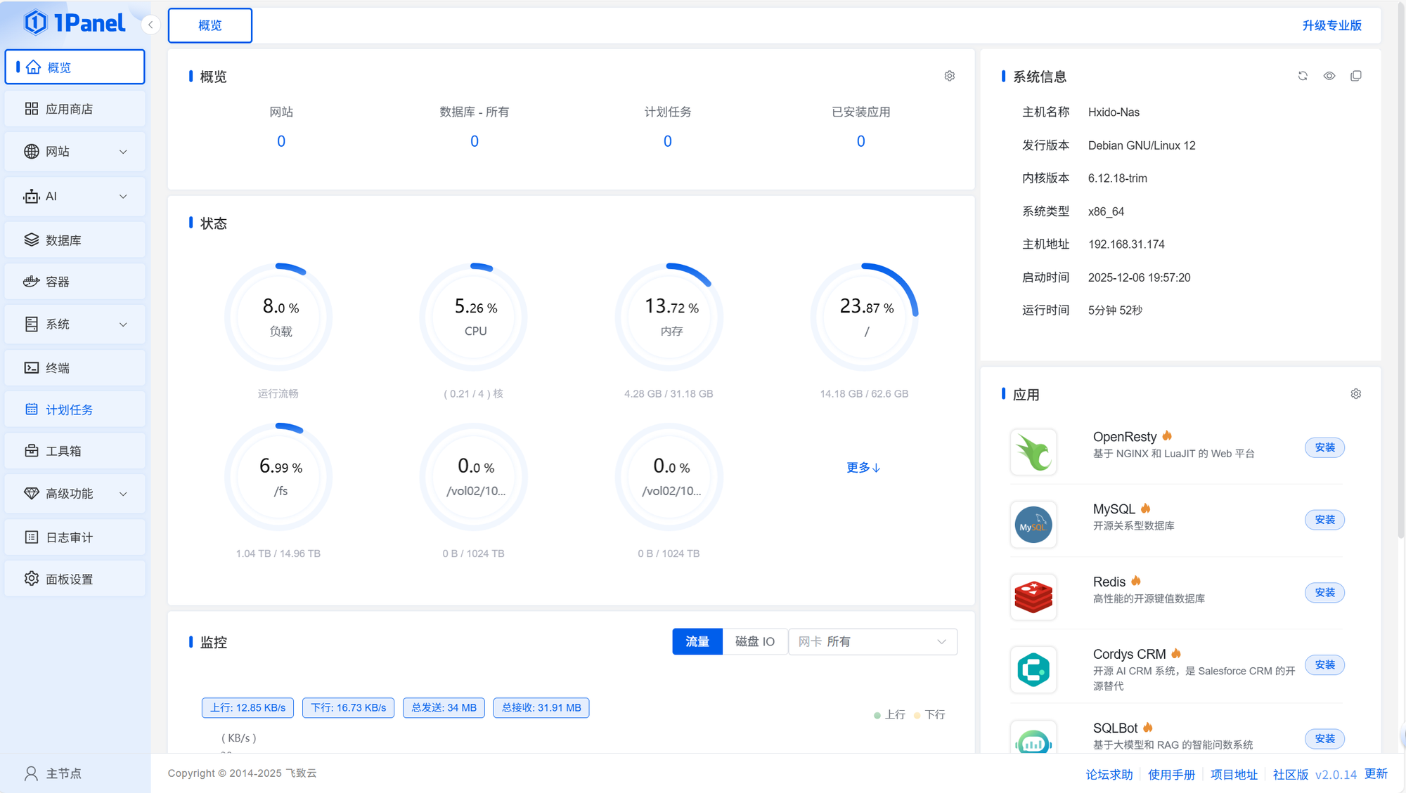 1Panel 是一款现代化、开源的 Linux 服务器运维管理面板,提供基于 Web 的容器管理、网站与反向代理、数据库与存储、文件管理、监控与告警等功能,适合将 NAS 或家用服务器当作“轻量化运维中枢”。借助其应用商店与 Docker Compose 编排能力,可以一键部署常见应用或粘贴官方 Compose 直接运行,显著降低命令行运维成本,尤其适合希望统一管理多容器服务的 NAS 用户。