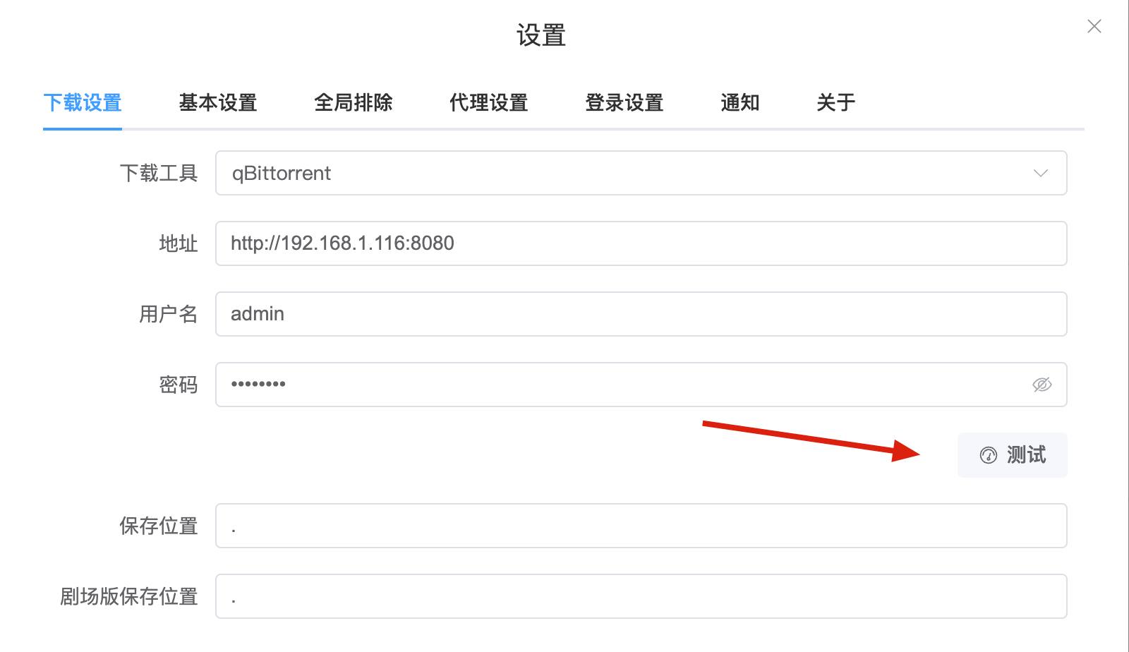- 在“设置”中完成下载工具的配置,如果使用qBittorrent,请按照实际情况配置并完成测试。