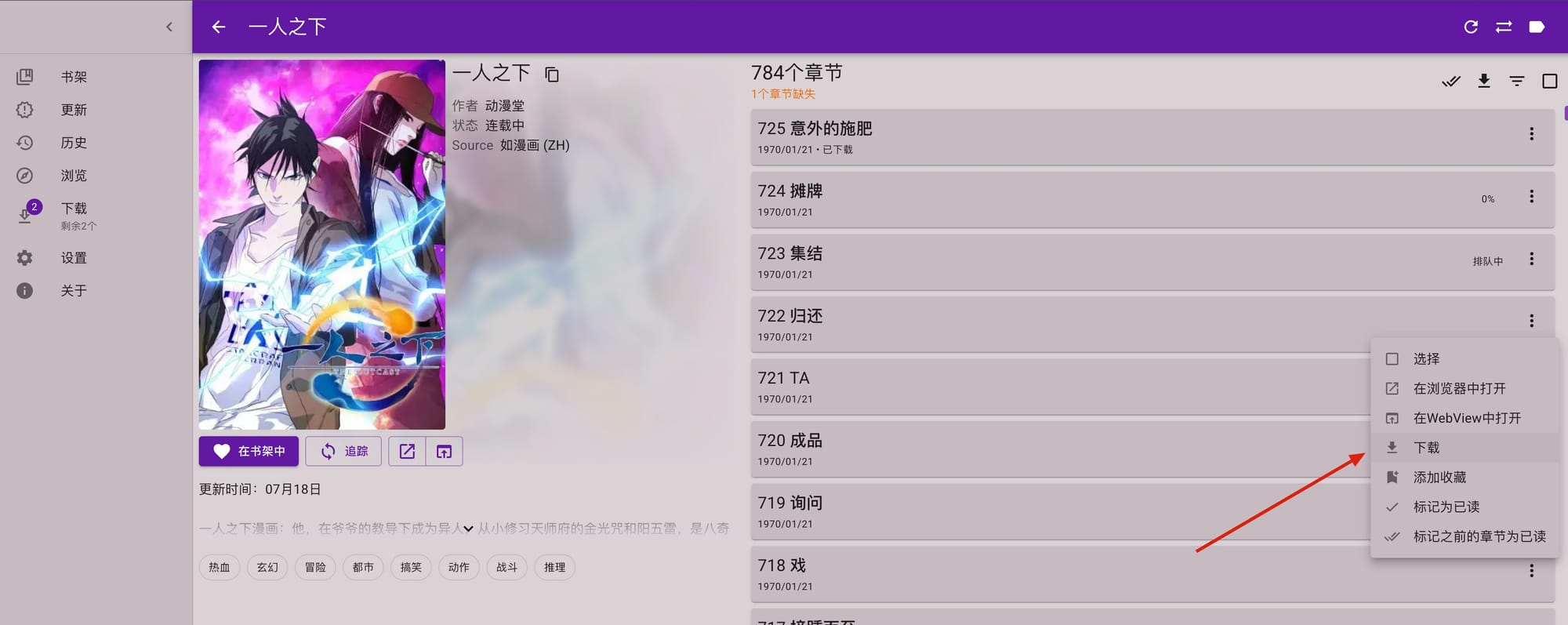 配置漫画源后,可检索并离线下载漫画资源,配合webui或者第三方客户端,即可免费追更。